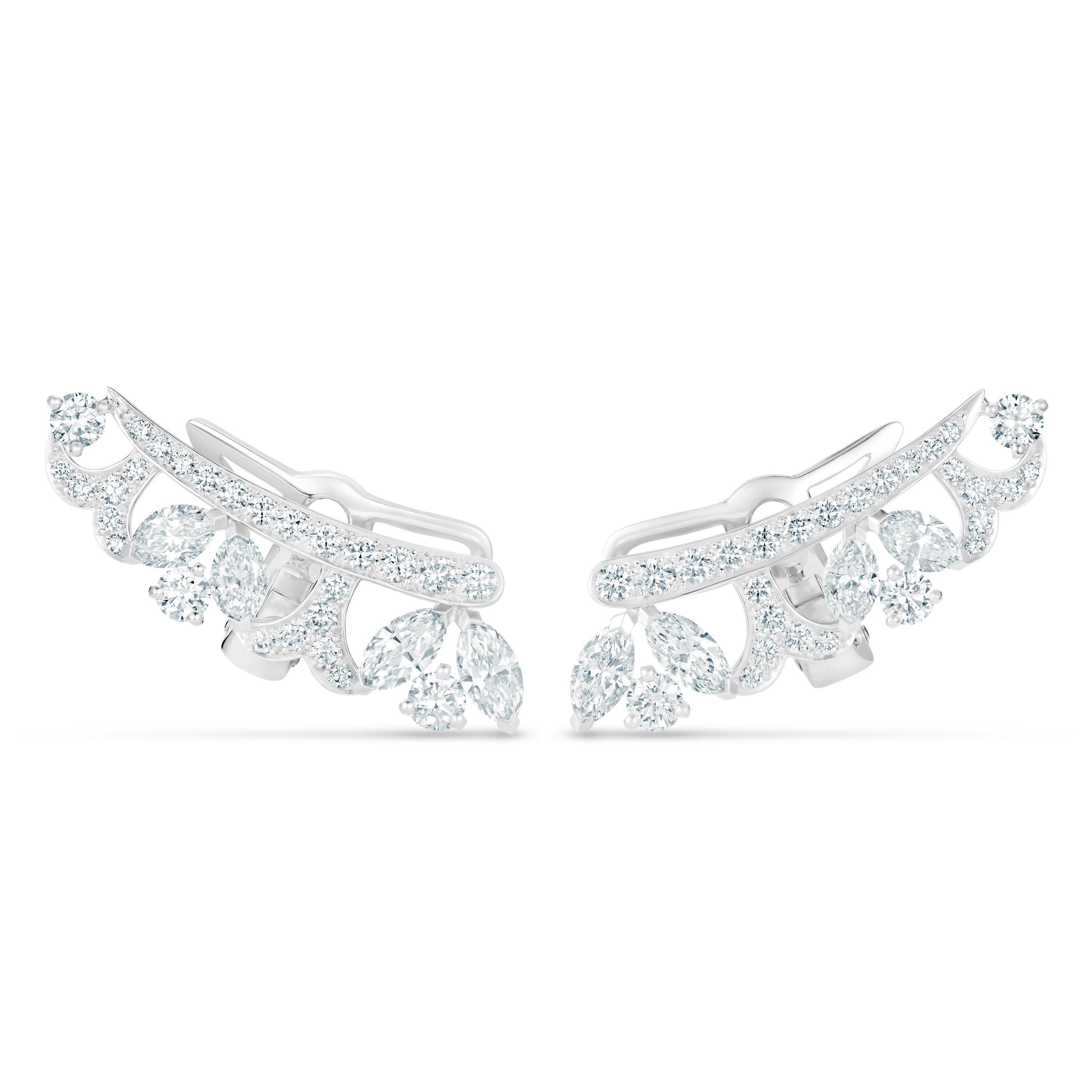 這款耳環作品以顆顆鉆石勾勒冰之純凈,贊頌冰雪中堅韌的極地柳之美。作品由 62 顆手工甄選的白鉆打造而成,鉆石總重為 2.49 克拉。圓形明亮式切割鉆石鋪鑲延伸,勾勒精致花紋,如枝葉攀緣而上,點綴于耳畔。末端綴有馬眼形切割鉆石,栩栩如生描繪著霜花的動人魅力。