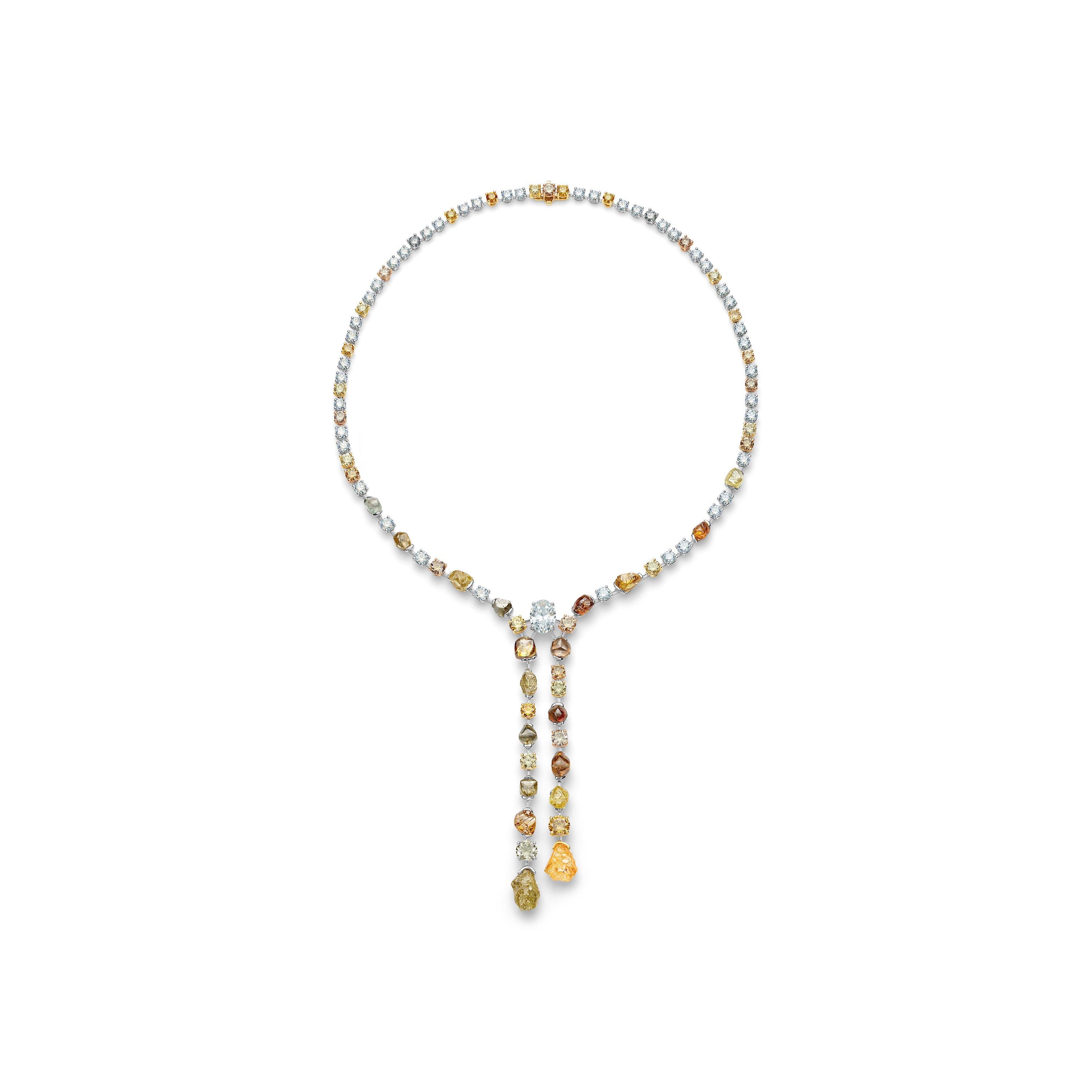 這件舉世無雙的鉆石項鏈共有 95 顆鉆石,總重約 61.36 克拉,與眾不同的顏色使其備受矚目。 項鏈以 18K 白金為底,采用包鑲工藝,交替鑲嵌兩排綠色、橙色拋光鉆石和原鉆,在18K白金上形成漂浮的立體美感。兩條鉆石鏈在胸前交匯于一顆約 2.81 克拉的白色橢圓形切割鉆石。 戴比爾斯的標志性搭配將原鉆和拋光的鉆石巧妙地結合在一起,每顆鉆石稀世罕見,獨一無二個性獨具。